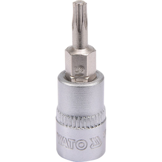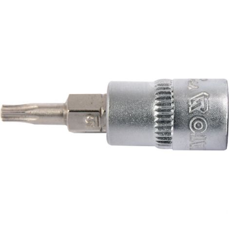 Professional TORX hex key, socket size 1/4 ", mandrel size T15. Chrome-plated socket made of CrV6150 steel, pin made of AISI S2 steel and coated with a nickel layer. An indispensable tool in a car or mechanical workshop.